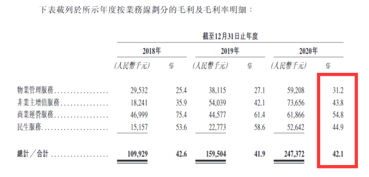 毛利率的下降也体现在聆讯后的资料中,但是物业费却高于行业平均水平。新希望服务2020年毛利率为42.1%,而较此前递交的招股书毛利率44.9%下降了2.8个百分点,而物业管理服务收入占比下降2.9个百分点。数据显示,于2019年,新希望服务的平均月度物业管理费为每平方米人民币3.69元,较中国物业管理服务行业高57.4%,主要是因为其在管物业项目位于一线、新一线及二线城市。