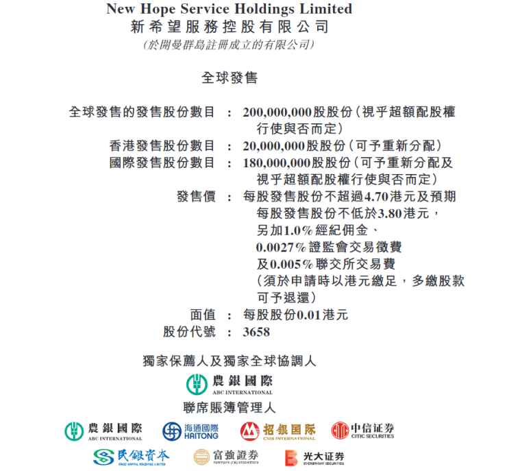 5月11日早间,新希望集团创始人、董事长刘永好家族旗下的物管公司“新希望服务”(03685.HK)发布全球发售公告,宣布在全球发售2亿股,最多募资约9.4亿港元,首次公开募股定价区间为3.8-4.7港元,并计划于5月25日正式在港交所上市发行,公司股票代码03685.HK,特别保荐人为农银国际。
