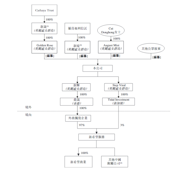最终,新希望服务的股权架构变为:Golden Rose持股90.8%,新远持股6.2%,崔东红占股3%。其中,Golden Rose由以刘永好的家族成员为受益人的全权信托Cathaya Trust(简称)100%控股。新远由雇员福利信托所控股的企业,August Mist为崔东红全资拥有。