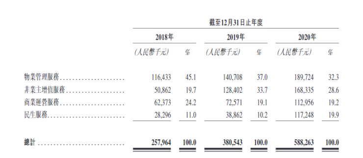 新希望服务的收入来自于物管服务、非业主增值服务、商业运营服务及民生服务四大业务。截止2020年12月31日,物业管理服务、非业主增值服务、商业运营服务以及民生服务收入占比分别为32.3%、28.6%、19.2%、19.9%。而在此前招股书显示,四大业务收入占比为35.2%、28.4%、20.9%、15.5%,其中,聆讯后资料中变化较大的为物业管理服务收入占比较此前下降2.9个百分点,民生服务收入占比较此前增长4.4个百分点。