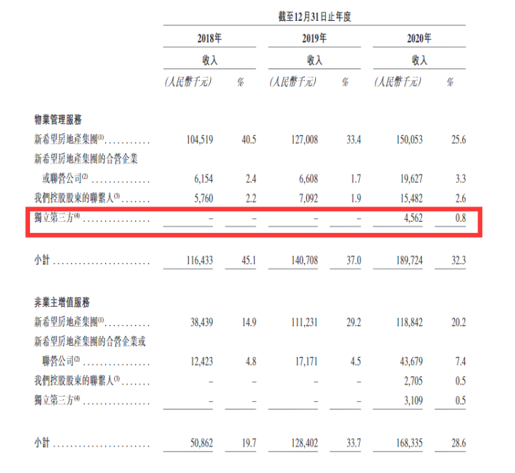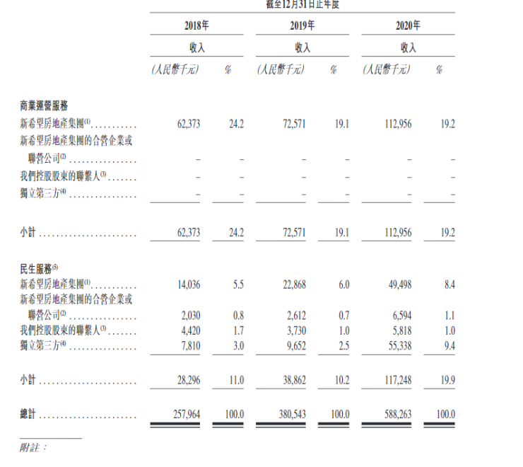 就收入结构来看亦能发现问题。营收方面,聆讯后资料显示,2018年、2019年及2020年,新希望服务的收入分别为2.58亿元、3.81亿元、5.88亿元;净利润分别为4110万元、6400万元、1.1亿元。而2018年、2019年及2020年,公司向新希望集团提供服务产生的收入分别为人民币6290万元、人民币1.325亿元及人民币2.424亿元,分别占总收入的24.4%、34.8%及41.2%。