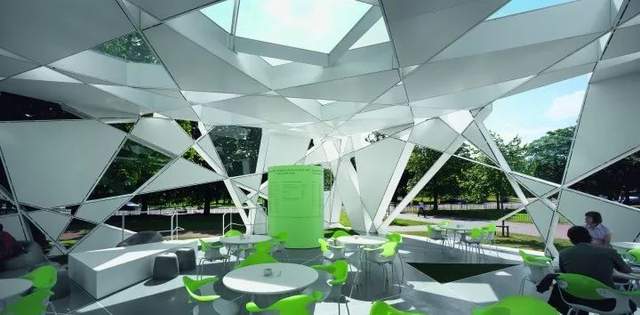 尽管看起来是由随机的三角形和四边形构成,但在伊东丰雄联手巴尔蒙德设计的展馆立面,实际上经过了方体扩展和旋转精确计算得出。这座展馆的不规则形状设计,在光和影、透明和实体之间做了一场“对比游戏”,也为建筑室内创造出有趣的效果。