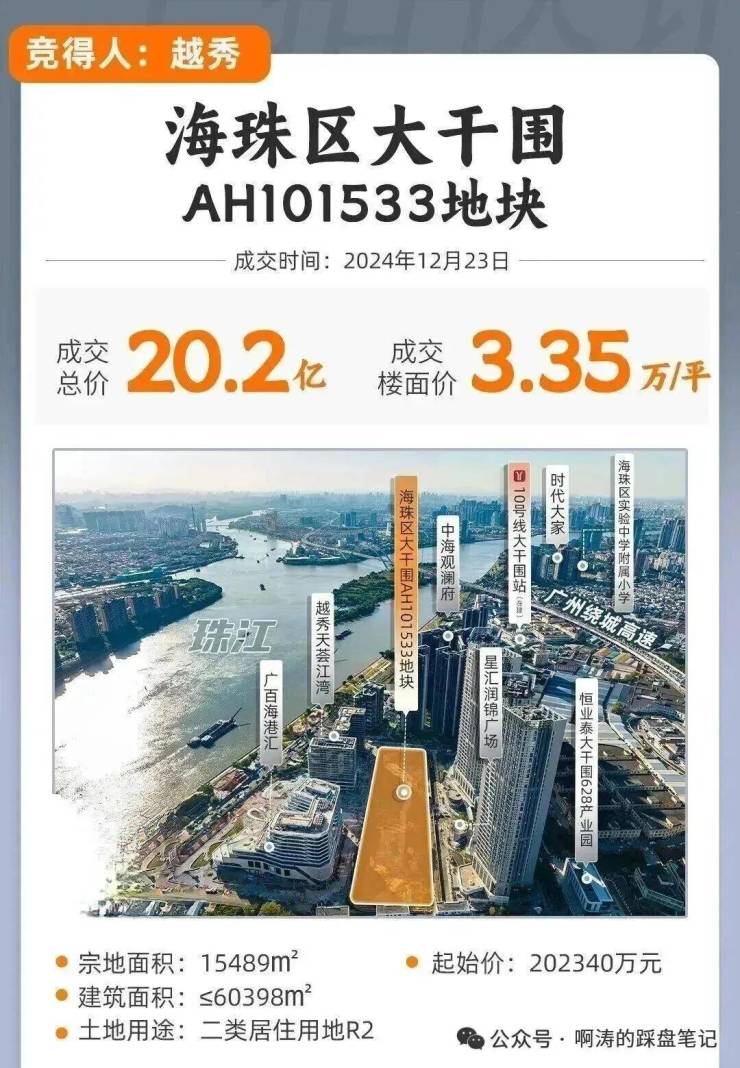 2024年12月23号,海珠大干围地块被越秀以20.23亿元拿下,楼面价为33501元/㎡。