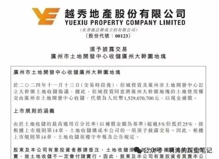 2024年11月13日,地块由广州土发中心中心收储,越秀地产因此将获得15.29亿元的现金补偿;