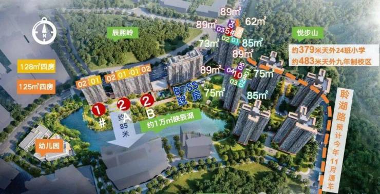 项目首推户型为建面约73-88㎡三房,住宅全南向布局,板楼可南向一线望映辰湖。