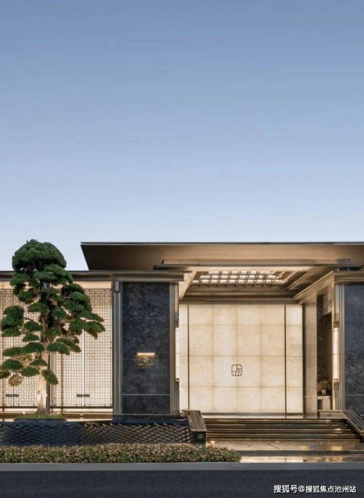 约60米全画幅门庭豁然展开,纳千年风雅于一境。两株超百岁树龄的罗汉松,跨越千里而来,静守世家门楣。金属格栅与天然奢石交织,光影流动间,勾勒出一幅现代东方的诗意长卷——天造一半,人造一半。门庭之上,良渚玉琮纹样化作迎宾重檐,西湖水韵幻为龙鳞叠水。东方符号融入现代构造,诠释世家气度与文化底蕴。