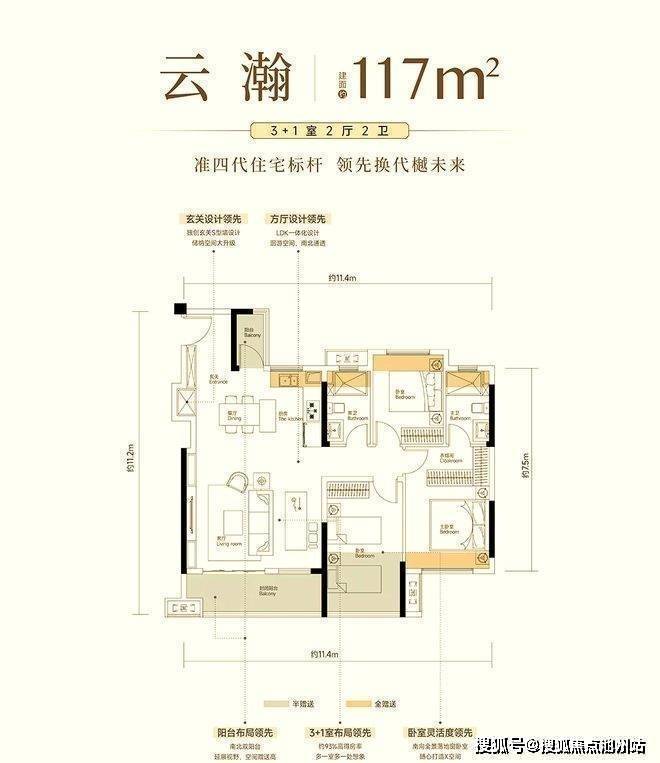 建面约117平方米,3+1室两厅两卫的灵动布局