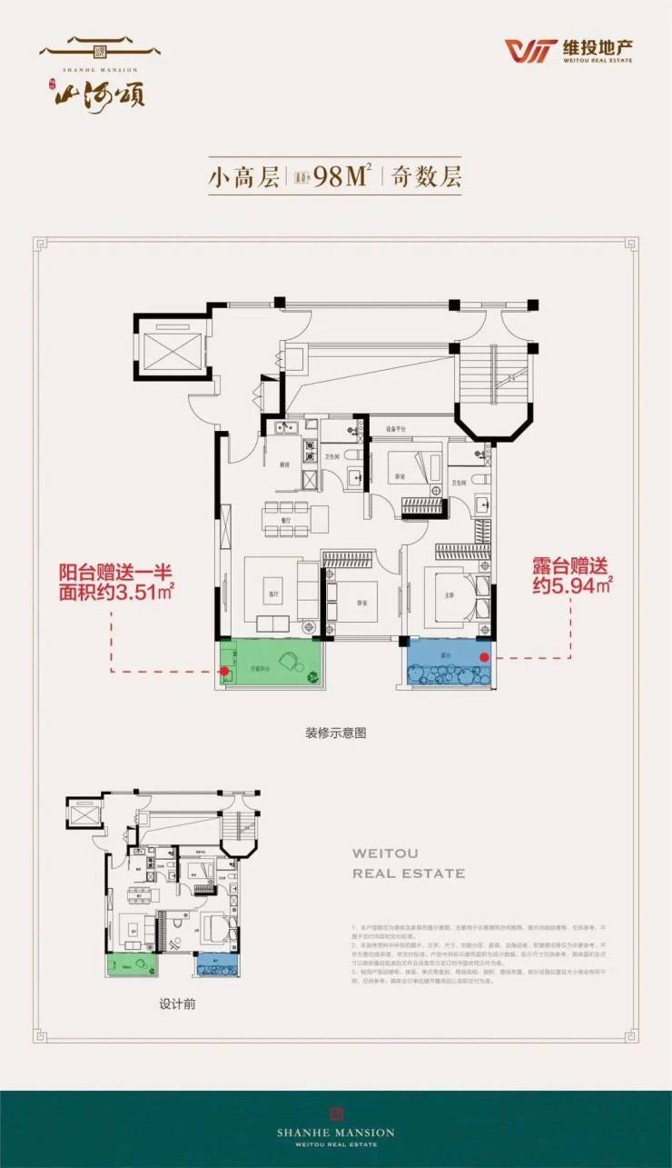 ③约118㎡户型,实得约143㎡,户户有露台,媲美市场160㎡户型;约98㎡三房两卫,实得面积约107㎡
