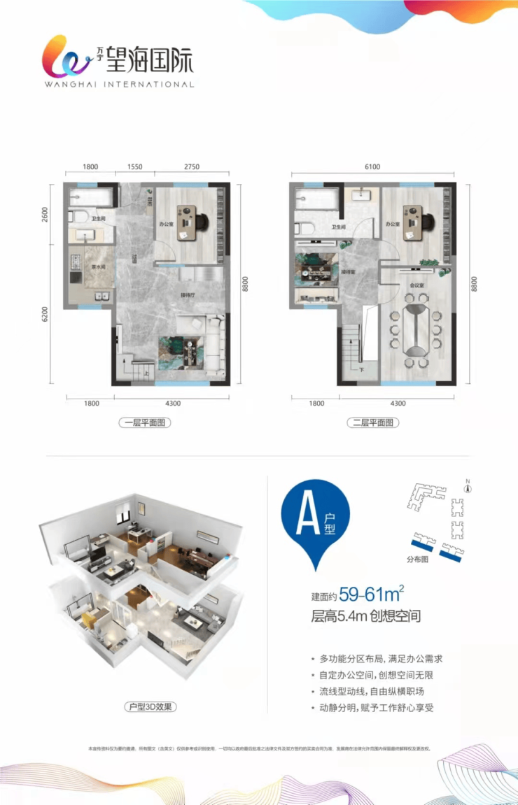一期户型:建面 55-73㎡,层高 5.4 米