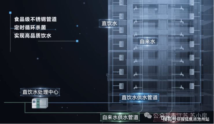社区搭建“两智一全”系统——智能安防、智慧社区与全屋健康系统。集中式高品质饮用水入户,食品级不锈钢管道、定时循环杀菌系统,保障饮水纯净。