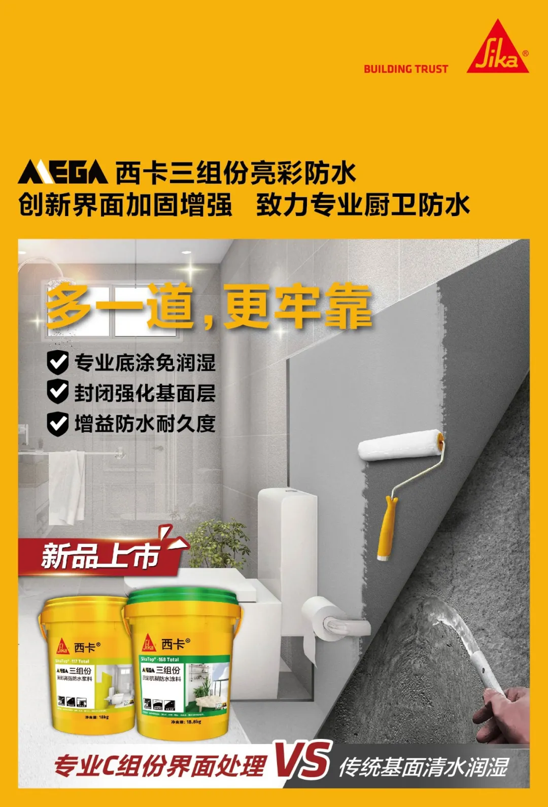 西卡MEGA防水组合在色彩上进行了全新升级,以清新亮丽的色差呈现,117 Total为刚性产品,168 Total为柔性产品。遵循“墙刚地柔”原则,能使厨卫间防水更耐久,涂刷效果一目了然,防止漏刷漏涂。