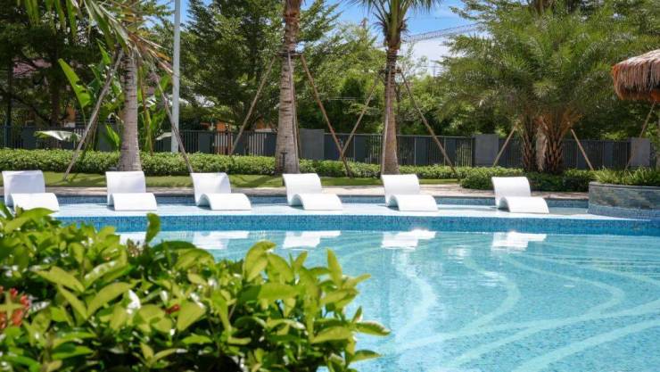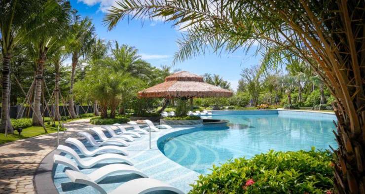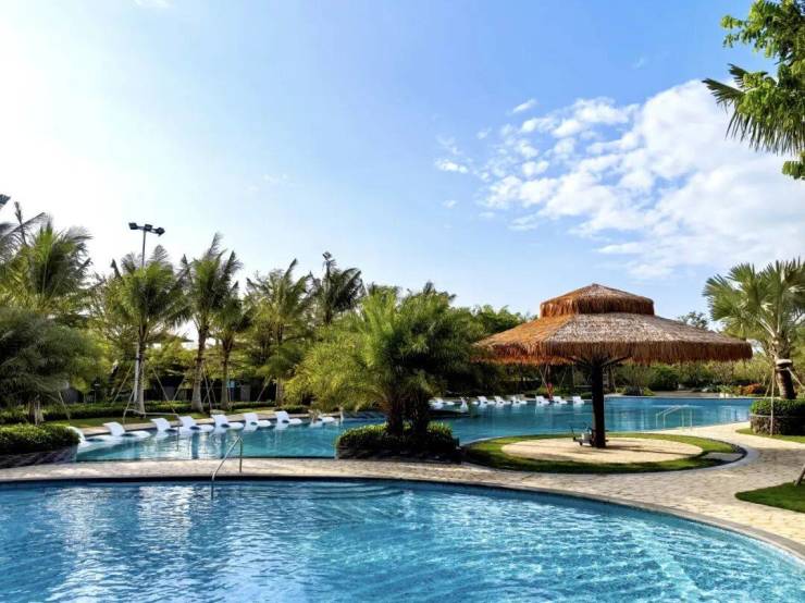 泳池乐园环绕旅人蕉与酒瓶椰,东南亚度假感拉满;“高山流水” 景观搭配蕨类,营造雨林静谧感。