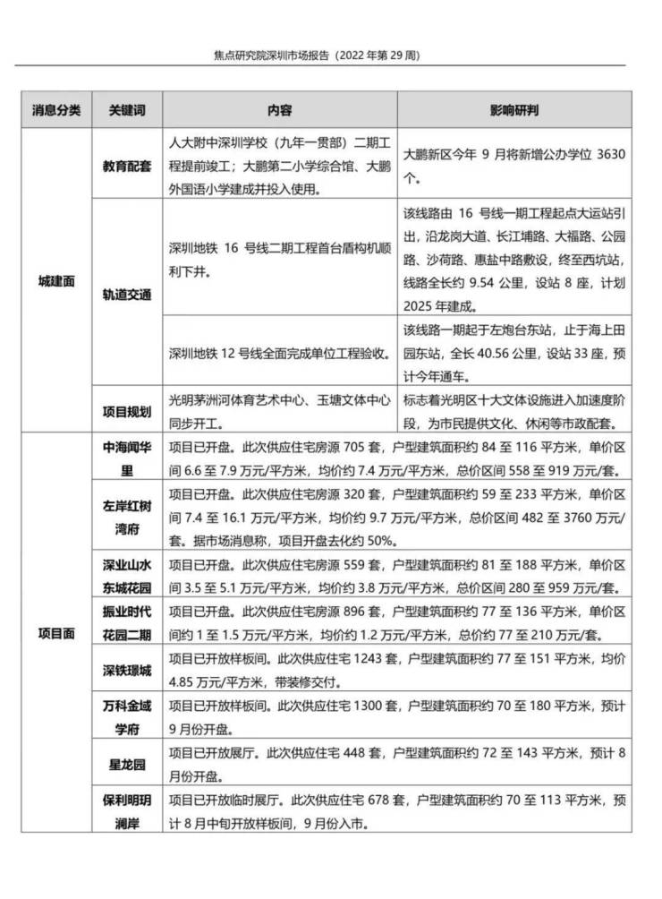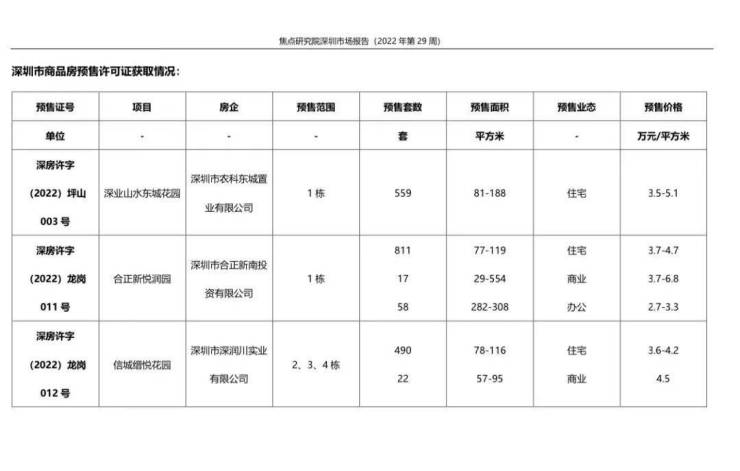 市场运行方面,当周3个住宅项目获取商品房预售许可证。其中,位于坪山的深业山水东城花园,备案住宅房源559套,户型建筑面积约81至188平方米,价格约3.5至5.1万元/平方米;位于龙岗的合正新悦润园,备案住宅房源811套,户型建筑面积77至119平方米,价格约3.7至4.7万元/平方米;位于龙岗的信城缙悦花园,备案住宅房源490套,户型建筑面积78至116平方米,价格约3.6至4.2万元/平方米。