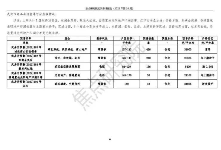 市场方面,上周共计5盘取得预售证,东湖金茂府、航发天虹城、香港置地光明地产印湖云著、江印为老盘加推;价格方面,东湖金茂府、香港置地光明地产印湖云著与上期基本持平;区域方面,5个楼盘分别分布于洪山、东西湖、蔡甸、江岸、东湖高新等区域;装修状况方面,航发天虹城、香港置地光明地产印湖云著是毛坯房源。