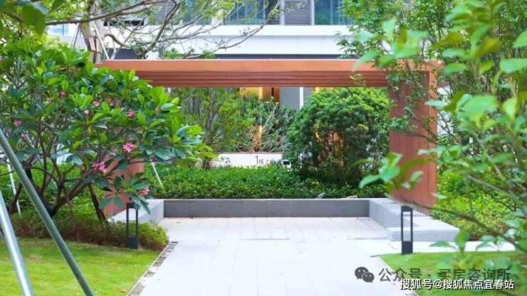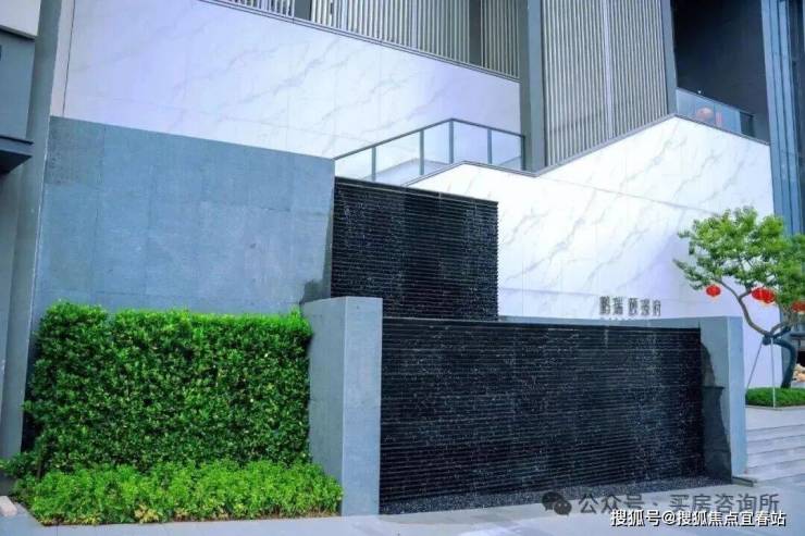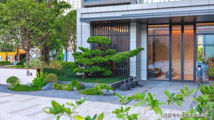 ◎ 三重松水对景,单元入户处以围合式绿植设计,打造私家入户花园院落布景,三座涌泉石墩于此潺潺吟唱,搭配名贵罗汉松、夜里雪花岗岩铺地砖,苍松迎客,水韵悠悠,以礼序之美开启归家首章。