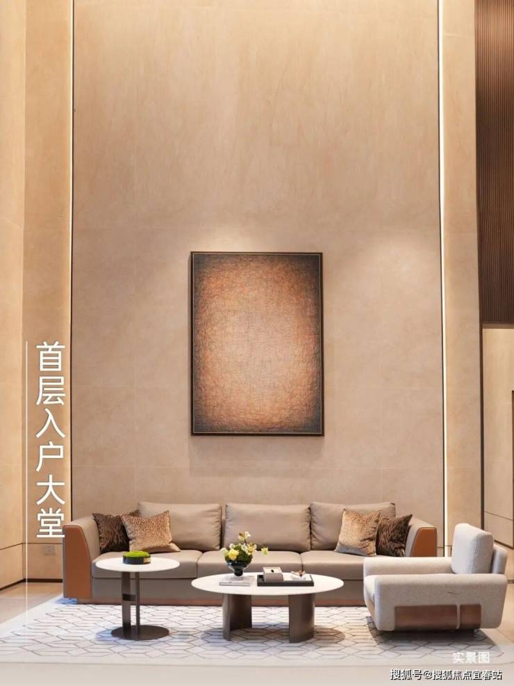 约5.1m高的入户大堂,地面用材精选天然大理石,墙面用材选用大尺寸仿石墙砖配合古铜不锈钢,呈现国际范的现代轻奢风格。颐璟府还细心为户主提供等待、会客和歇息的便利,设置茶几、沙发、挂画,精心布局,为户主的归家增添一份仪式感。