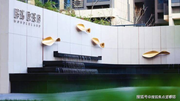 ◎二重叠水鱼雕,寻景而入,在步移景换间,邂逅一方“鱼跃龙门”的逸致水景,景墙运用葡萄牙金米黄石材,国际知名艺术家执笔艺术专利,让穿行于深圳湾1号的鱼雕艺术,游走在鹭璟府的恢弘叠水之上;