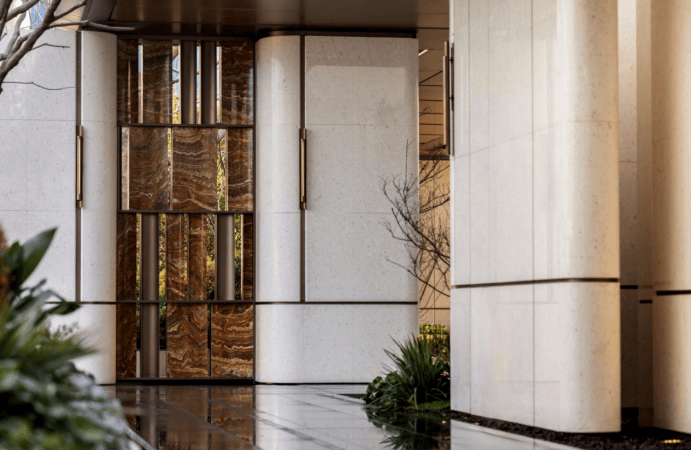 门庭延街的外立面,以精工定制弧形 米色石材 为主调,镶嵌典藏级 老虎玉大理石 ,点缀 古铜色现代海派艺术感灯器 ,整体呈现出百年海派的贵雅气质。