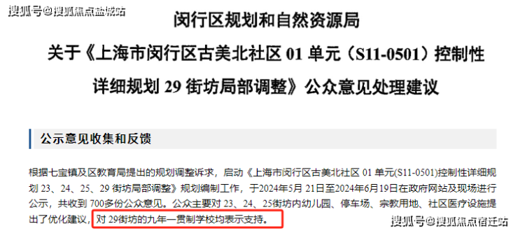 10月18日,闵行区规划和自然资源局发布《上海市闵行区古美北社区01单元(S11-0501)控制性详细规划29街坊局部调整》批后公告,表示支持29街坊的九年一贯制学校建设。