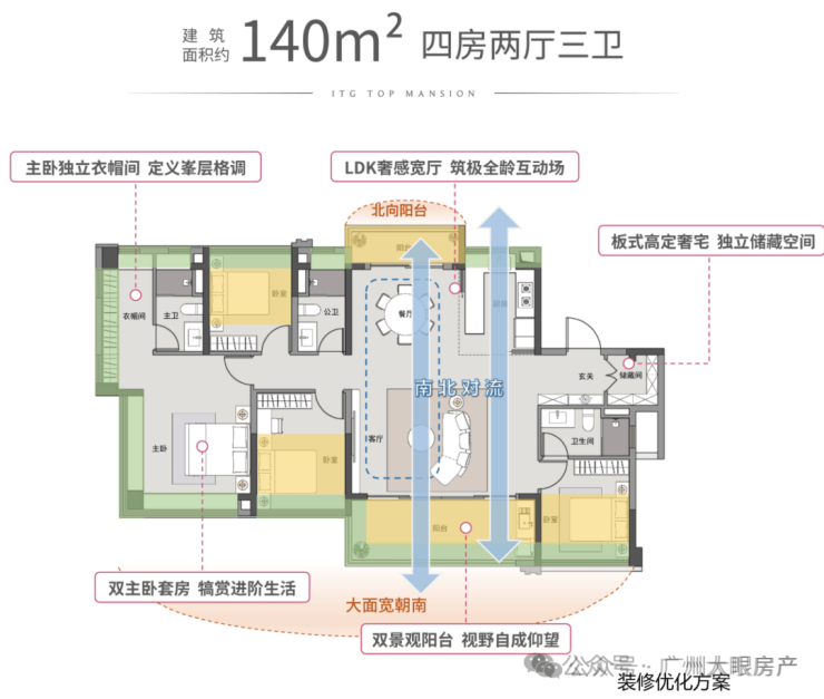 140平四房三卫,不超豪宅线做四房三卫,挺不错的。只在8#楼小高层,专梯入户。南北双阳台,格局和123平很像,可以看作125平户型的升级版。