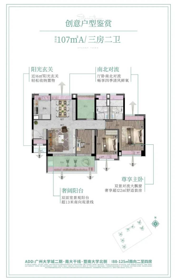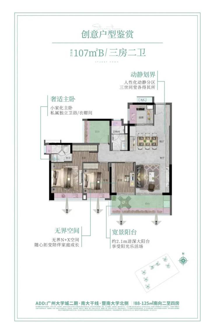 舍弃北向小户型:打造100%全南向产品,全盘找不到北,采光通风最大化;