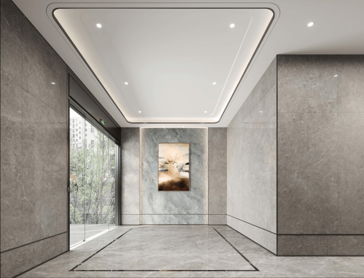 墙面与地面,采用灰色纹理瓷砖,高端且大气;电梯门头,则采用类古铜色不锈钢,通顶设计,搭配极简筒灯,营造现代质感。