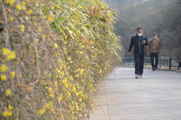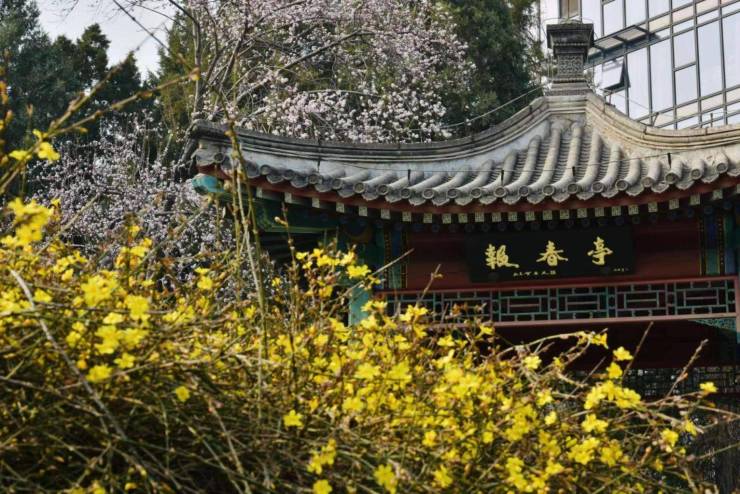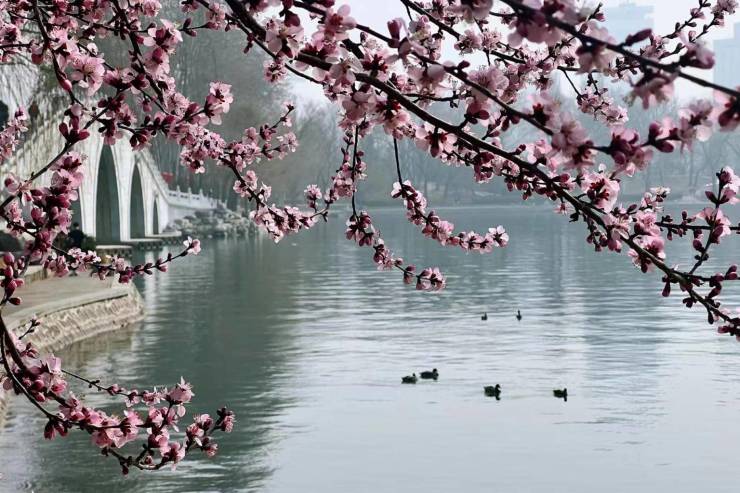 不入园林,怎知春色如许。古建旁、湖岸边的山桃、迎春已经绽放,玉兰、樱花、柳芽也在枝头翘首,吸引着游客的目光,淡粉的花苞、嫩绿的叶芽,远看如烟似雾,初春景致正当时。