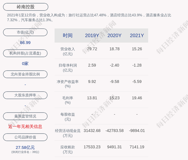 每经AI快讯,岭南控股(SZ 000524,收盘价:12.98元)3月22日发布年度业绩报告称,2021年营业收入约15.26亿元,同比减少18.71%;归属于上市公司股东的净利润亏损约1.28亿元;基本每股收益亏损0.19元。分配方案为:不分红、不送红股、不转增。
