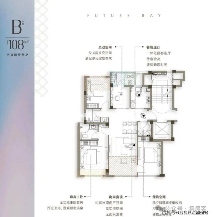 餐客厅开间6米,面积达到约60方,媲美200方大平层居住体验,主卧采用270度飘窗设计,可更好的提升主卧采光及景观。