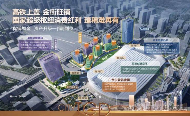 白云站预计未来日均客流将达20万人次;商铺楼上数万固定办公客群消费所指,周边超170+重点项目、20余栋超级总部大厦、超6.2万户常驻消费人口。