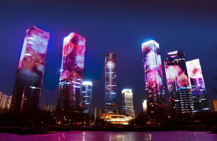 朝阳区大望京建筑组群楼体上,五彩斑斓的“电子烟花”在空中绽放,金色的凤凰展翅腾空,用一场场精彩灯光秀为市民送去新春的喜悦和祝福。