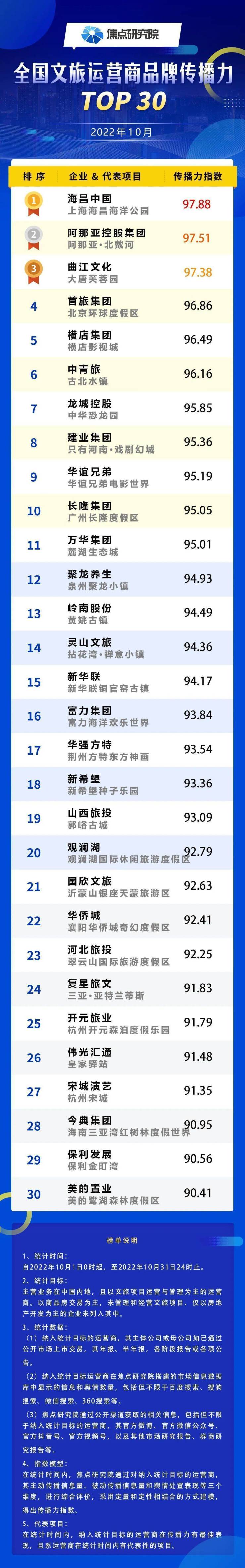 2022年10月全国文旅运营商品牌传播力TOP30| | 海昌中国借国庆假日拔得头筹