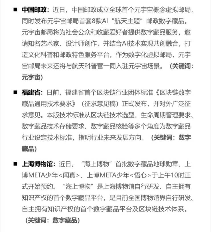 本周,中国邮政成立全球排名前列元宇宙概念虚拟邮局,同时发布元宇宙邮局首套8款AI“航天主题”邮政数字藏品。元宇宙邮局将为社会公众和收藏爱好者提供数字藏品服务,邀请知名艺术家、设计师创作,并结合AI技术实现共创融合,打造文化科普和邮政特色服务平台。