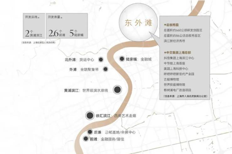 - 东外滩杨浦滨江是约364万方商办建筑规模的千亿级世界科创中心,汇聚多家科创头部产业和领军总部集群。 教育与企业聚落 - 项目周边有10所核心高校、150余家科研院所,形成世界文教之核。