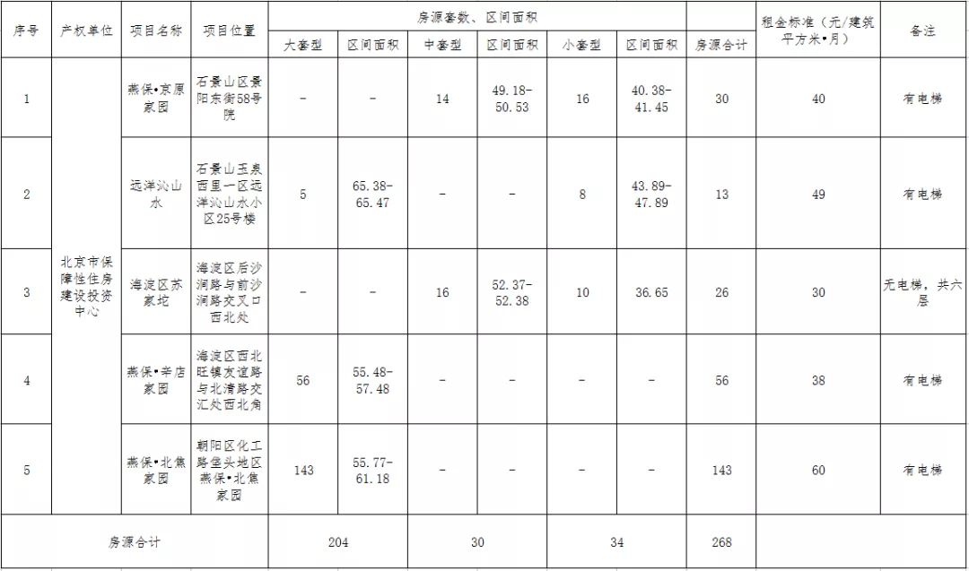 此次配租房源涉及5个公租房项目,房源共计268套。项目 详细情况见下表: