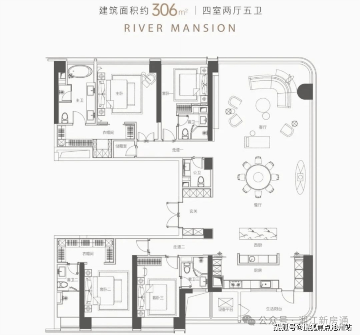 四梯两户私密体系:双独立入户动线+全套房设计,主卧临江浴缸打造“云端生活场”。