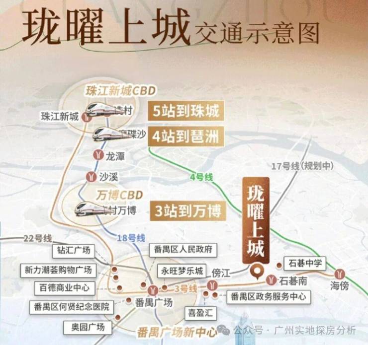 项目距离地铁3号线东延段石碁南站约600米,通过3号线可直达珠江新城、万博CBD等核心商圈,无缝对接18号线、22号线,半小时内可达市中心,一小时畅行粤港澳大湾区。