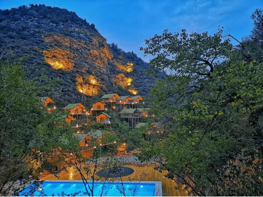 位于密云干峪沟村,从北京驾车,2个小时的车程,从城市趋向森野,长城脚下,世外桃源般的代名词,鸡鸣狗吠,袅袅炊烟,虫鸣山花,隐居在深山,栖居在帐篷里。如今的山里寒舍由30户农家大院和100顶山间帐篷组成,帐篷内麻雀虽小,五脏俱全,"家家"都有可观山景的小阳台,独立卫浴+洗漱空间,各色功能区分割合理... 除了帐篷,另外一部分则是古朴院落,所有客房都在原有老房的基础上装修改造而成,保留了之前的木门、木窗、