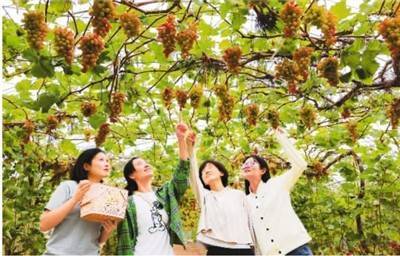 游客在山东省青岛市西海岸新区的一处葡萄园采摘。