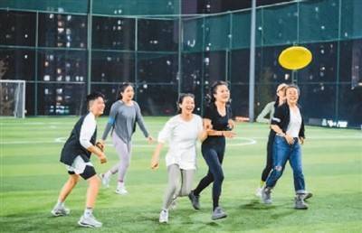 在重庆市江北区溉澜溪体育公园内,市民参与飞盘运动,锻炼身体。