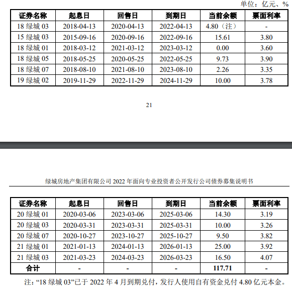据绿地房地产透露,截至目前,未来两年内到期/回售公司债券余额约 117 亿元,本次债券拟偿还/置换的到期/回售公司债券包括但不限于如下债券: