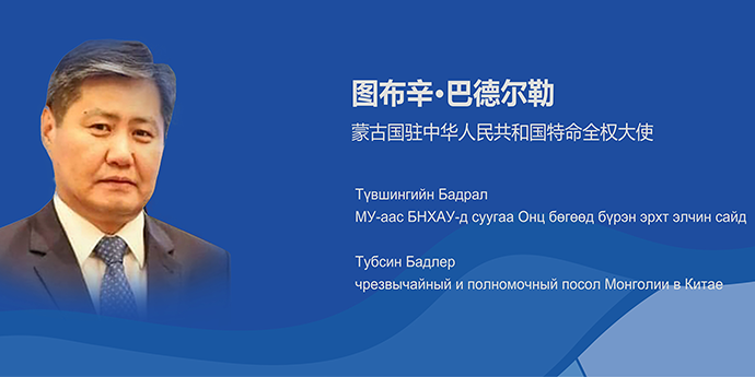 会上,蒙古国驻中华人民共和国特命全权大使图布辛·巴德尔勒通过国际连线远程发表致辞。