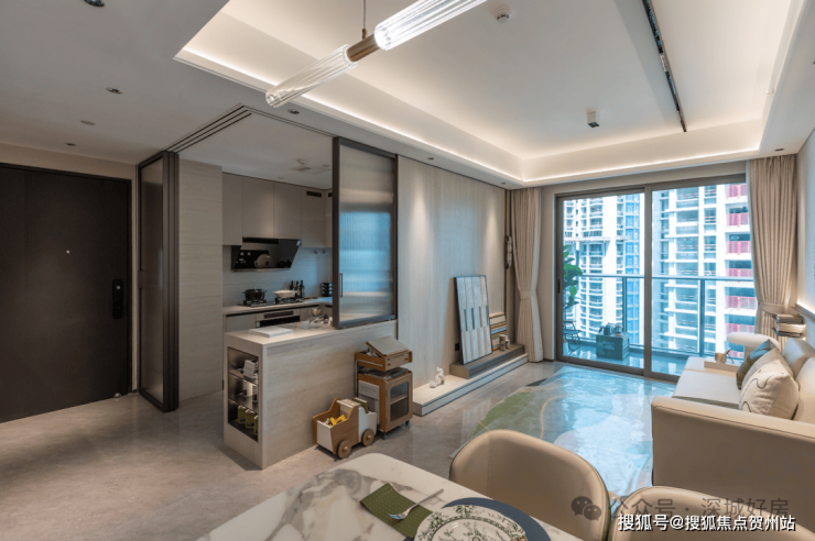 设计的是竖厅格局,客厅3.2米开间,三开间朝南,3个卧室分别做到了主卧16.41㎡/次卧7.71㎡/次卧7.4㎡(包含墙体飘窗),公卫带2㎡的设备平台,得房率约:97%(包含赠送),东南朝向看观澜河景观。