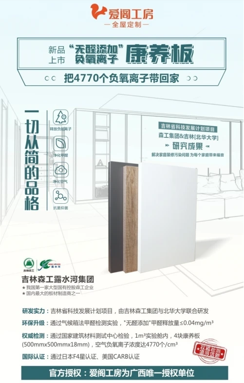 爱阁工房与国内知名板材制造企业吉林森工达成战略合作关系,是吉林森工露水河“无醛添加”负氧离子康养板(甲醛释放量≤0.04mg/m³)广西指定合作运营商。该板材具有持久释放负氧离子、净化空气、分解甲醛的功效,并已通过美国CARB认证、日本F☆☆☆☆认证等国际权威认证,致力于为消费者打造健康养生的居家环境。先进的品质、优异的环保性能和特殊的净醛功能是其他板材所不具备的,在市场上具备显著竞争优势。