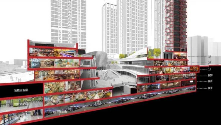 其中商业综合体包括地下三层商业MALL和地上三层公园购物街区。