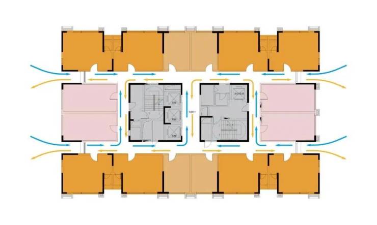 摒弃传统单过道,采用双环通走廊,极大提升通风采光
