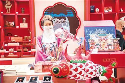 身着汉服的少女、悬于梁顶的鱼灯、充满唐俗唐趣的特色文创……陕西展馆内,一处以影视剧IP《长安十二时辰》为灵感打造的“唐风市集”,吸引了众多游客驻足。