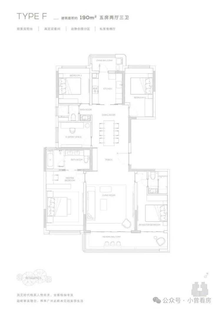 190产品为五房两厅三卫产品,充满了对云端人群生活的独特见解,南向双主卧,中西厨布局,打造纵向超长LDK一体化空间,产品所体现的不只是居住产品,更是特属客群所拥有的生活方式。