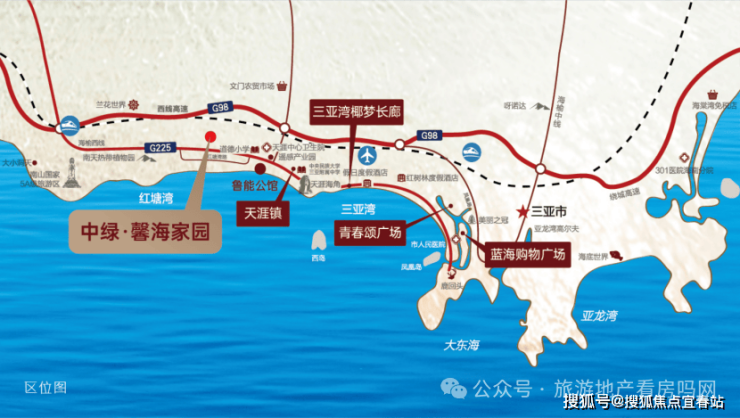 中绿馨海家园项目落址于红塘湾旅游度假区,毗邻红塘湾七横路,紧邻G225国道、G98环岛高速,依托国道、高速串联凤凰路、三亚湾路、迎宾路等。项目距离G225国道约500m,距离天涯镇约3.5km,距离三亚湾椰梦长廊约10km,距离青春颂广场约25km,距离蓝海购物广场约27km,可迅速抵达三亚核心商圈,为居者悦启一城繁华生活。