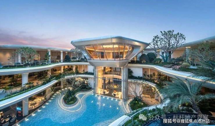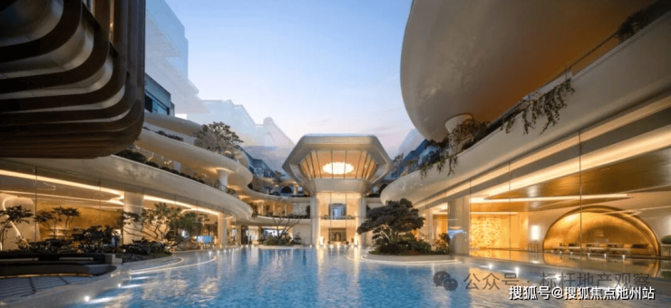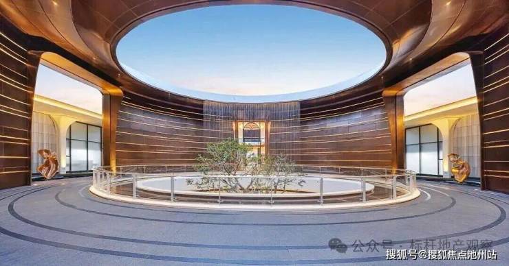 元序打造三折柔美弧线勾勒“垂直竹节”立面,兼具未来感与中式韵味。光环门廊拥有超百米宽、近11米的挑高,两侧约8米加纳利海枣与约5米塔形罗汉松,一眼望去豪奢气势。
